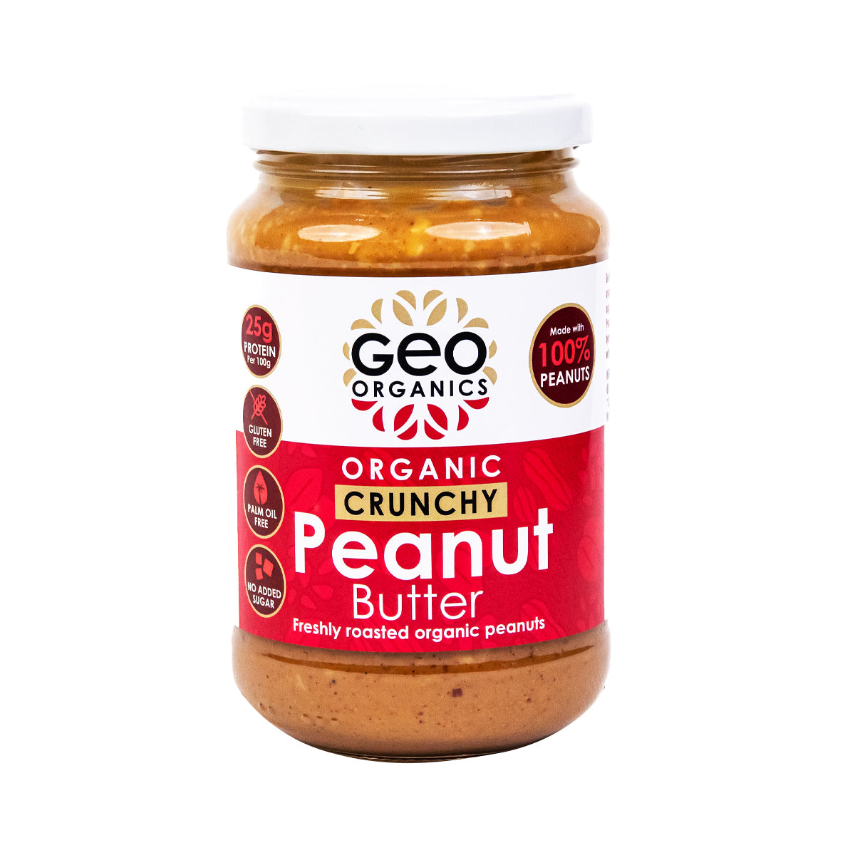 Geo Organics 100% Natural Crunchy Peanut Butter is naturally sweet with a satisfying texture. We make it in small batches from select, freshly roasted organic peanuts with no added sugar or palm oil. Not even salt is used in this exceptional product, only 100% organic peanuts. Peanut Butter is a great source of protein, fibre, and good fats. It's perfect with toasted bread or bagels, delicious with your favourite fruit, and can be added to your recipes for a nutty flavour.