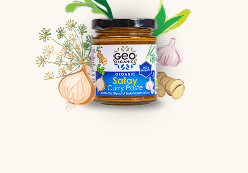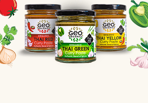 Sizzle: Heat 2 tbsps of cooking oil, and 2 chopped cloves of garlic, fry until soft. Add 1/2 jar of GEO ORGANICS THAI RED PASTE and cook for 1 min to release the flavour.